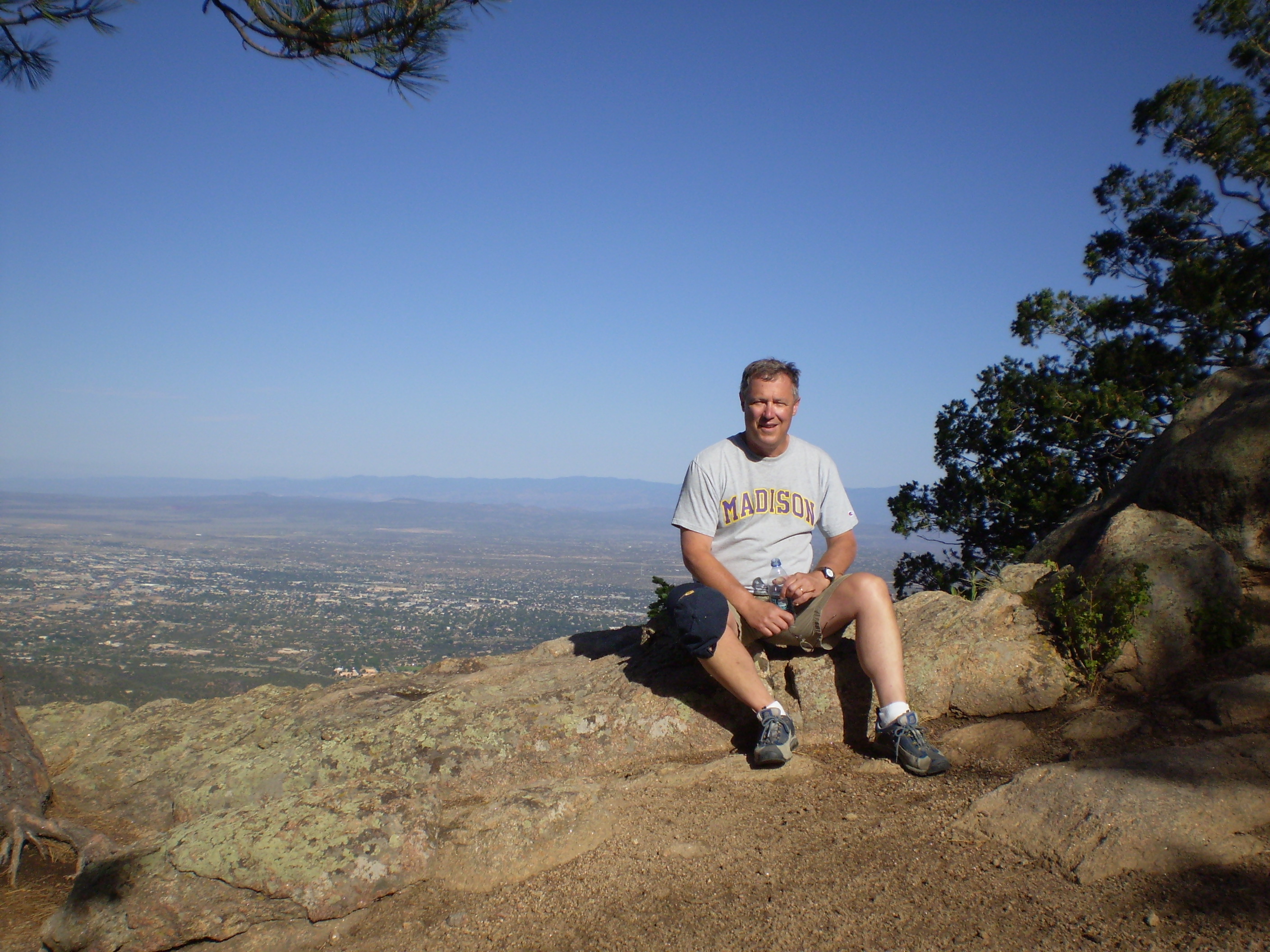 And climb we did, or at least tried. Confident in my lungs, accustomed to running long distances (but at sea level!), Keith and I began a 2000 foot ascent with the certainty of two rather ignorant fools! Two hours later, gasping for air and parched with thirst (yes, we didn’t even bring hydration for a desert hike!), we came to our senses and descended quickly. Five days later we were successful, having acclimatized to the altitude, starting the climb very early in the day, bringing sufficient energy bars and, yes, a good supply of water. Here we are at the top of a 9200 foot summit, tired, sore, but VERY happy: